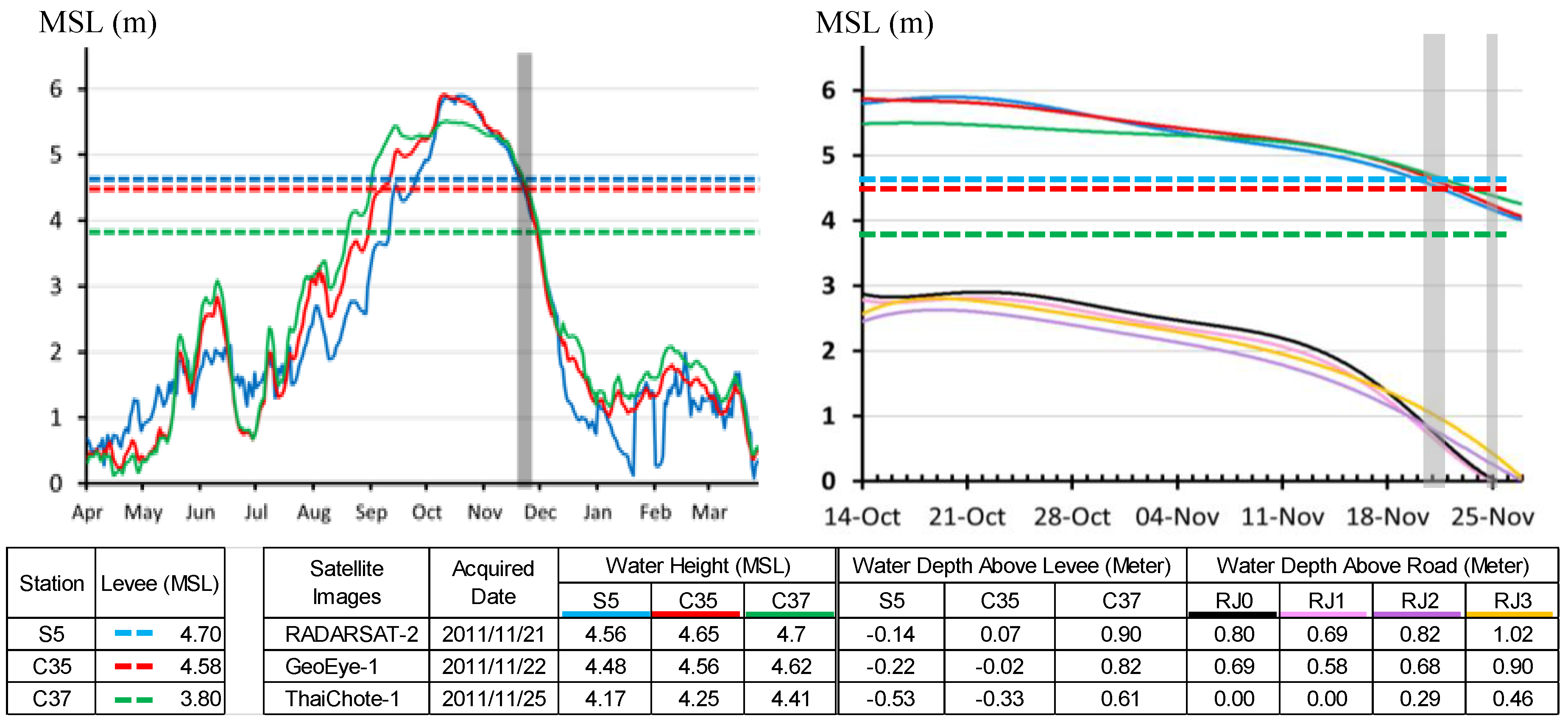The solid lines in the left graph show the water heights at the three telemetry gaging stations over a one-year period (April 2011 to March 2012). The period over which the satellite images were acquired was at the end of the flood event, when the water level had dramatically decreased. Although the water heights were slightly different on 22 November 2011, they had significantly dropped more than 30 cm in three days by 25 November 2011.