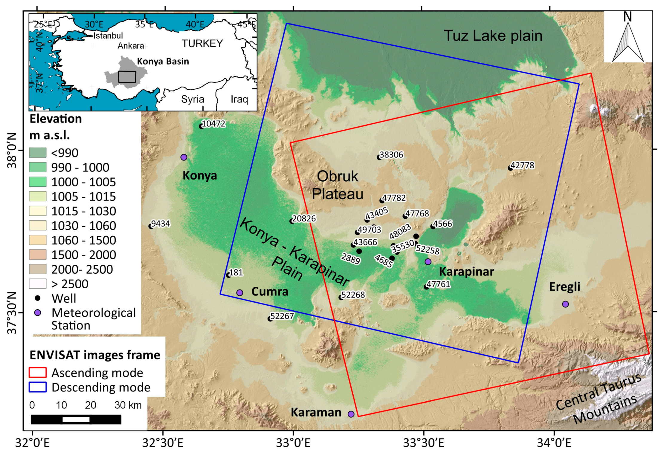 The study area is located within Konya basin, central Anatolia, which is the biggest endorheic basin in Turkey extending over an area of about 54,000 km2, with elevations ranging from 900 m to 3500 m above sea level (a.s.l.) (Figure 1). The basin lies on the northern side of the Central Taurus Mountains which have an important role on surface and sub-surface water supply. The Konya basin has a typical arid to semi-arid climate with a long-term average yearly precipitation of 380 mm, ranging from 250 mm in the plain areas to more than 1000 mm in the mountainous areas in the south [5], and an evapotranspiration of about 550–600 mm per year. Winters are generally cold and wet whereas summers are hot and dry. Despite having such a dry climate with low precipitation input, there are extensive and intensive agricultural activities in the region, whose main source of water is the groundwater which is extracted via more than 92,000 groundwater wells distributed around the basin [34]. In the last years the increase of irrigated land (about 3700 km2) related to some cultivations like sugar beet and corn caused an increase of groundwater consumption. The estimated groundwater consumption in 2010 was about 2.7 billion m3 [35]. Numerous smaller fresh/brackish wetlands have dried out in the last decades as consequence of groundwater depletion [5].