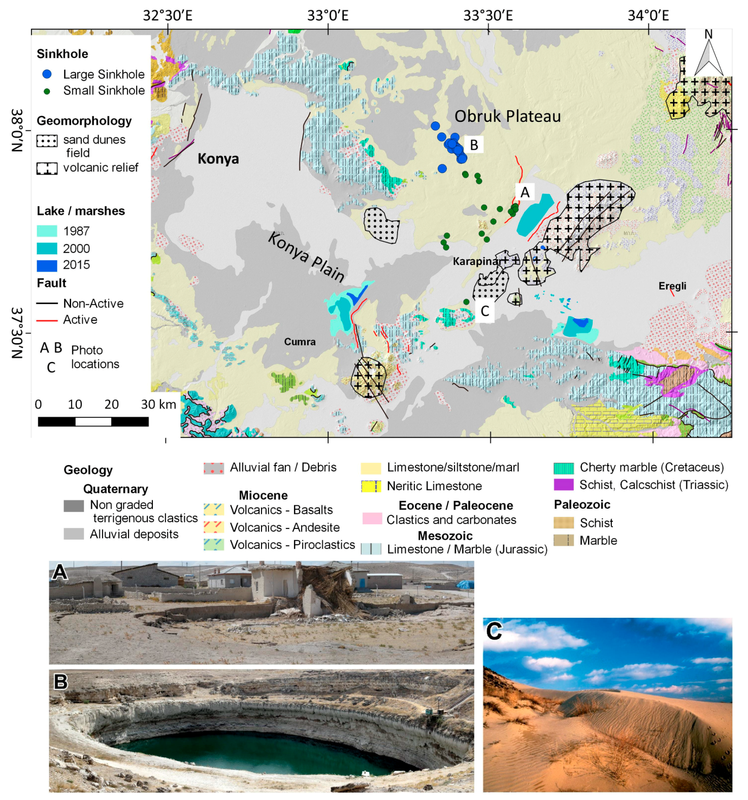 Geological and geomorphological map of the study area (adapted from [37]). Dynamic geomorphological processes in the study area: (A) Active and (B) relict sinkholes near the Seyithaci and Kizoren settlements, respectively; (C) Karapinar sand dune field (photo courtesy of Atlas Dergisi).