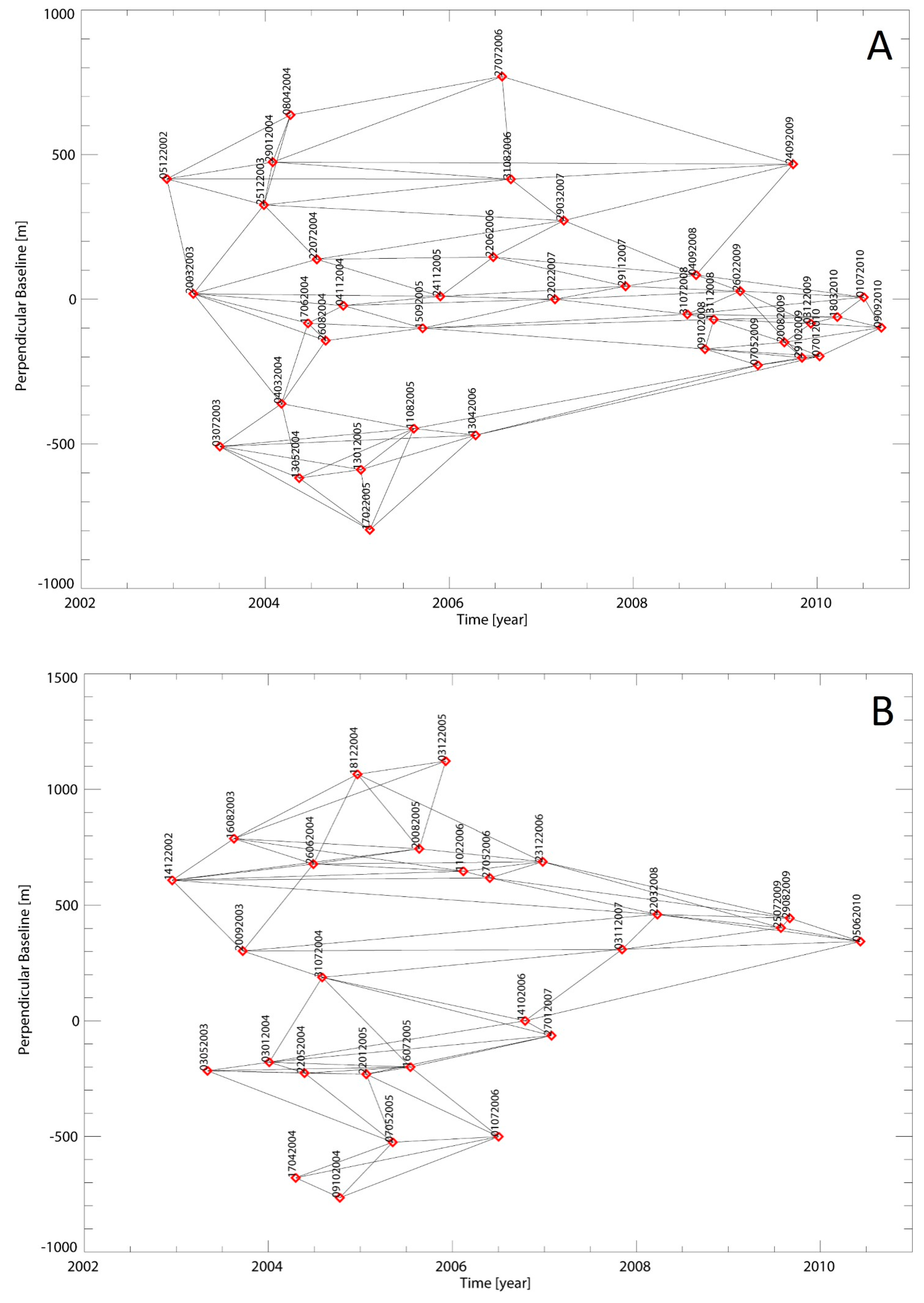 Distribution of ENVISAT acquisitions (red points), used in the SBAS processing, in the temporal (x-axis)—perpendicular (y-axis) baseline plane for the descending (A); and ascending (B) dataset. Black arcs show the computed interferograms.