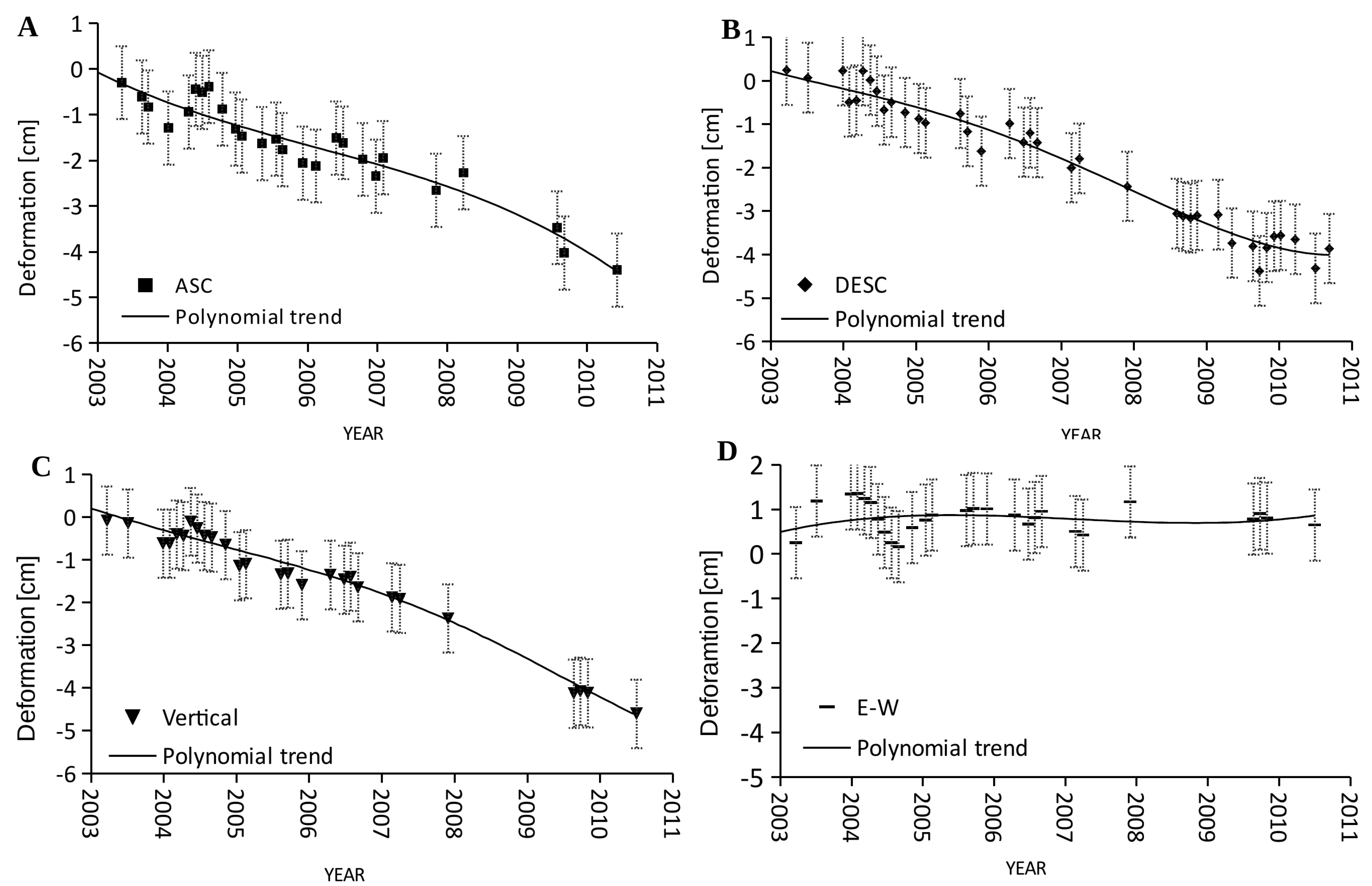 Maps of the vertical and (E-W) horizontal components of the surface displacements are shown in Figure 4C,D. The horizontal movement component can be considered negligible confirming that the regional deformation process mainly occurs along the vertical direction (Figure 4C). This is also clearly visible from the inspection of the achieved time-series revealing that significant vertical displacements reaching up to 10 cm have occurred, with an average deformation rate of about 1.2 cm/year for the period 2002–2010 (Figure 5).