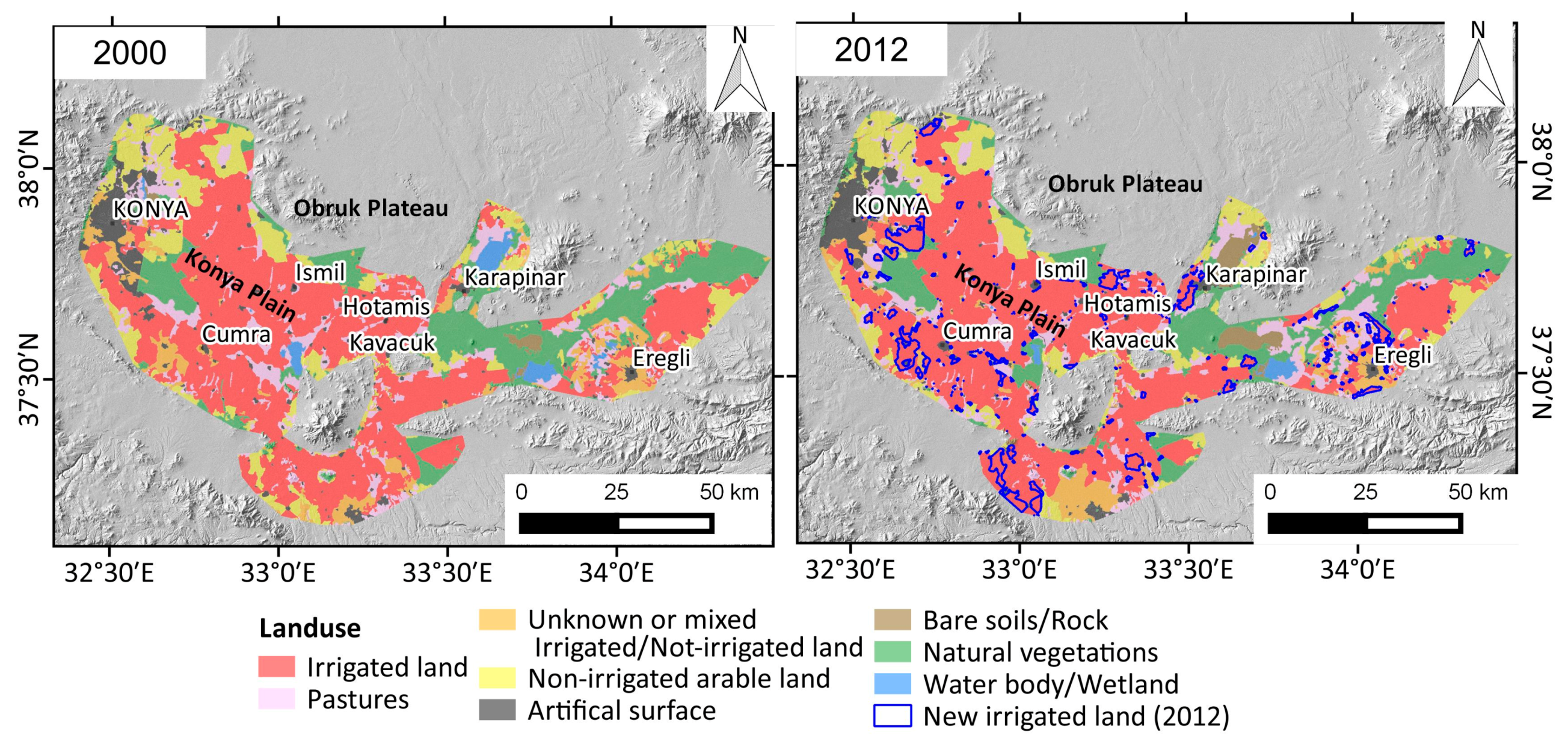 CORINE Land Cover simplified maps of the Konya plain for years 2000 and 2012. Blue polygons in 2012 map show areas changed from non-irrigated to irrigated.