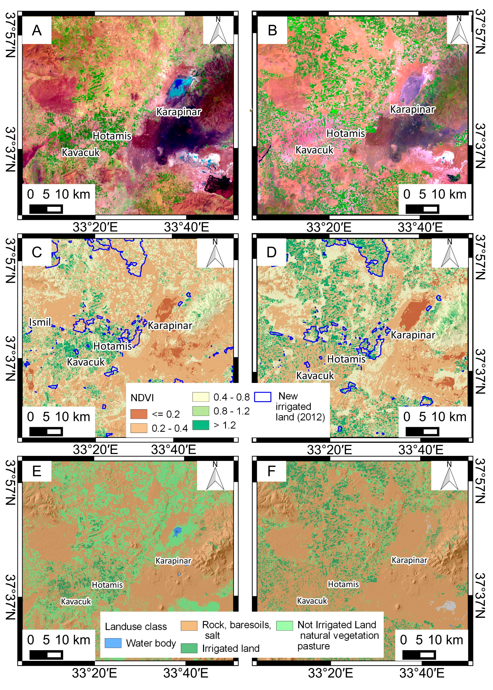 Table 7 reports the LC changes affecting the area during the 12-year analyzed period. It is interesting to note that irrigated lands, pastures and urban areas (i.e., artificial surfaces) increase while natural vegetation, unknown/not irrigated land and water bodies decrease. Such detected land cover changes are usually associated to an increase of demand of water supply which main source, in this area, is represented by groundwater [5]. Indeed, the increasing of crops (e.g., sugar beet and corn) translates into more irrigation needs as well as the growth of urban areas (i.e., of population and industry) and pastures (i.e., of breeding) leads to higher water consumption. Land changes that may be correlated to groundwater overexploitation are also analyzed by using a Landsat 5 TM image acquired on May 2000 and a Landsat 8 image taken on May 2015 (Figure 7A,B). Visual inspection of the two images reveals a clear pattern of crops in 2015 which is not visible in 2000, pointing out an increase of land covered by intensive agriculture and irrigated fields over the 15-year period of analysis. Such an observation is not straightforward for the area around Hotamis, probably due to a change in cultivation type that is not visible in the 2015 image. Moreover, a supervised classification of SAGA GIS based on the maximum likelihood method (Figure 7E,F) was applied. Landsat images were classified into four land cover types: (1) water bodies; (2) irrigated land; (3) not irrigated land/natural vegetation/pastures; (4) rock/bare soil/salt. Classification results, within the sample area, are in agreement with CORINE data, showing that irrigated lands increased from 7% to 14% while not-irrigated lands decreased from 26% to 11% (Table 8).