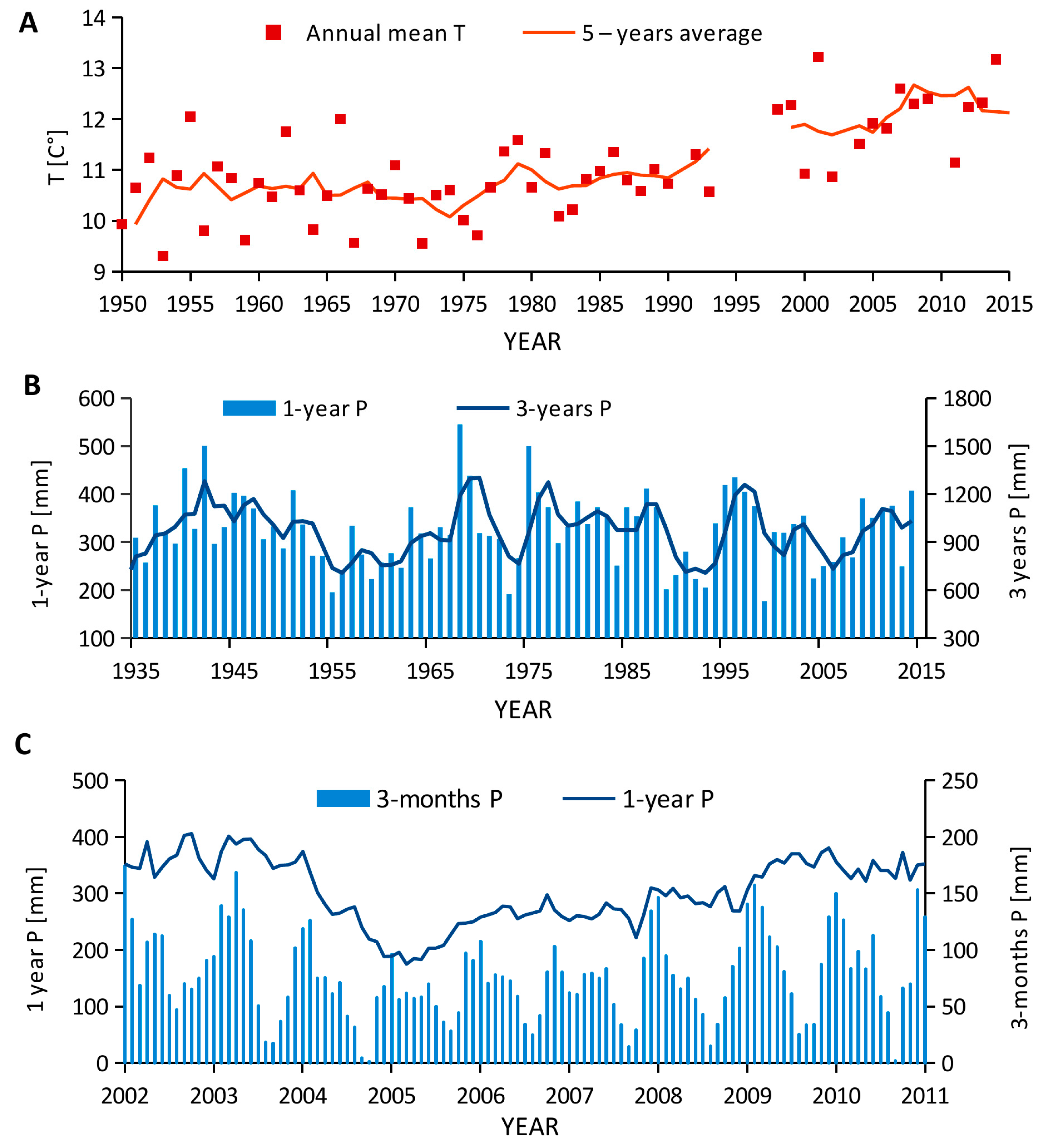 The analysis of data recorded by the available meteorological stations (Figure 1, Table 4) allowed the identification of precipitation (P) and temperature (T) variations occurred in the area.