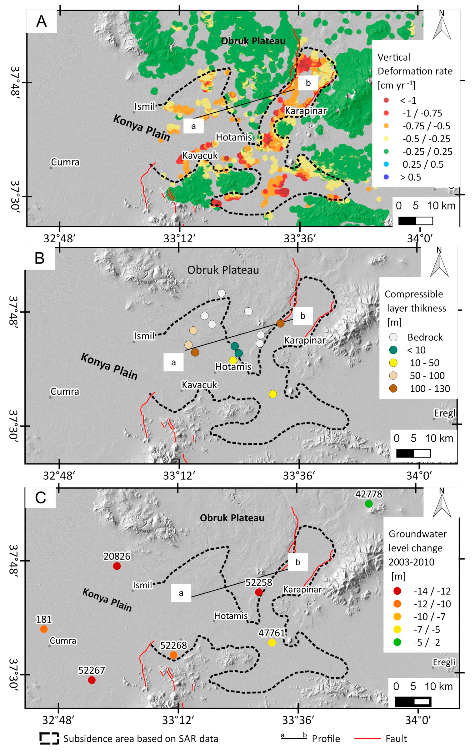 Groundwater level variations in the study area have been investigated by analyzing data acquired by a local network of piezometric wells. Figure 9C shows the cumulative water table depletion during the period 2003–2010, estimated from wells located in the subsidence area. Wells recorded a significant decrease of the piezometric level up to about 14 m, except for well 47,761 located at south of Karapinar, which measured a lower decrease (about 2 m).