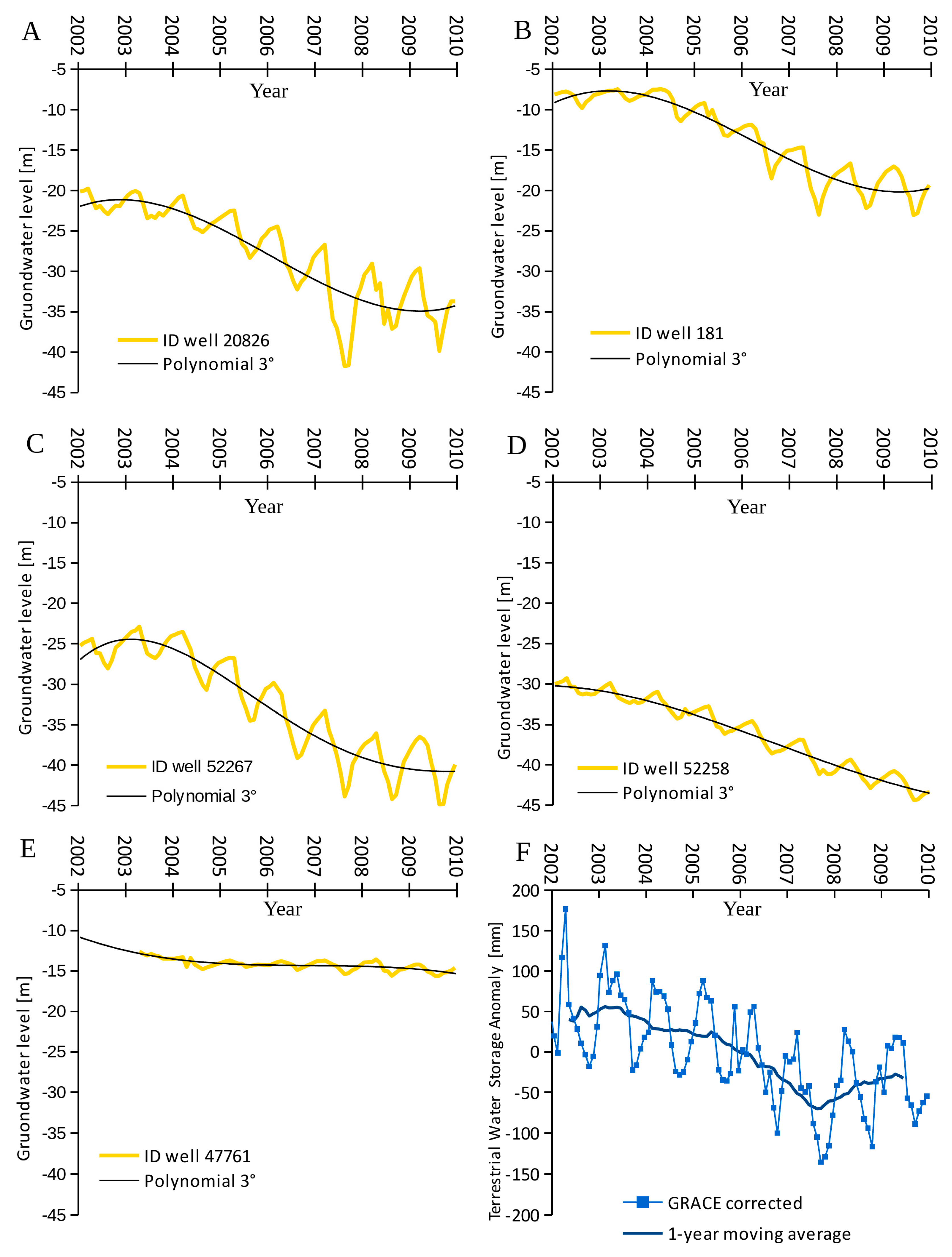 (A–E) Groundwater level measured in four wells; (F) Water storage anomaly changes derived from GRACE data.