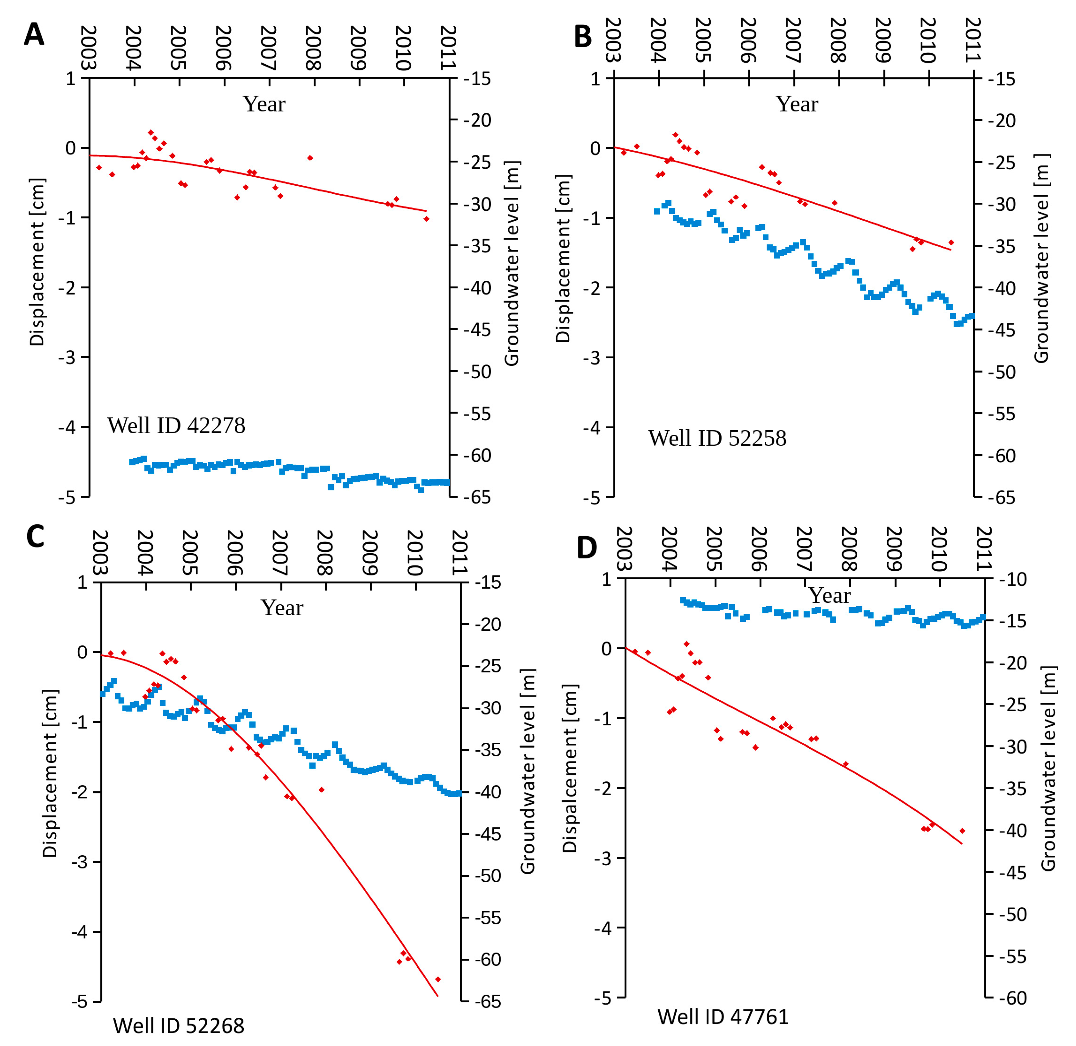 Average of DInSAR vertical deformation time-series (red squares) associated to SAR measure points located in similar geological and morphological units, within a distance variable from 1 to 2 km from the relevant well, vs. groundwater level measurements (blue squares). (A,B) refer to wells located on the limestone plateau and on the boundary between plateau and plain area, respectively. (C,D) refer to wells located within the plain area.