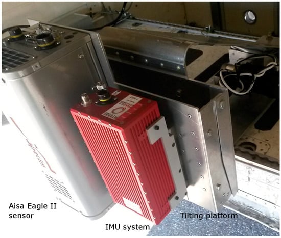 Hyperspectral AISA Eagle II sensor and IMU system on a tilting platform looking in the nadir direction through the cargo bay entrance at the rear of the aircraft. The cables connecting the instruments have been removed for better visibility. We configured the sensor to scan with a 60 Hz framerate. The chosen configuration resulted in square pixels of approximately 60 cm for nadir view; in off-nadir directions, the pixels were slightly elongated (Table 1). Full technical characteristics of the sensor are given in Table 2.