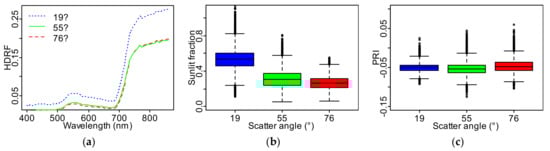Average Scots pine top of canopy (TOC) spectral reflectance (a), Scots pine canopy sunlit fraction (b) and Scots pine canopy photochemical reflectance index (PRI) (c) for three scatter angles ( 19°, 55° and 76°).