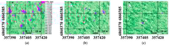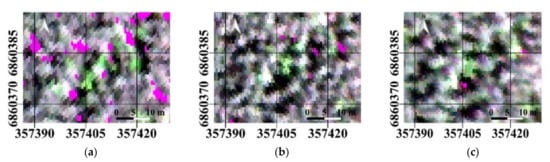 True color images of the focus area (red rectangle in Figure 2) inside the test polygon showing spatial variation in Scots pine canopy brightness for different scatter angles ( 19° (a); 55° (b); 76° (c)). Purple pixels were masked out; normalized difference vegetation index (NDVI) < 0.8.
