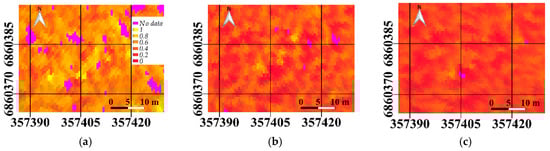 Spatial variation of the canopy sunlit fraction for 19° (a), 55° (b), 76° (c). Purple pixels were masked out (NDVI < 0.8). The color scale is the same for all three rasters.
