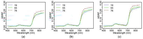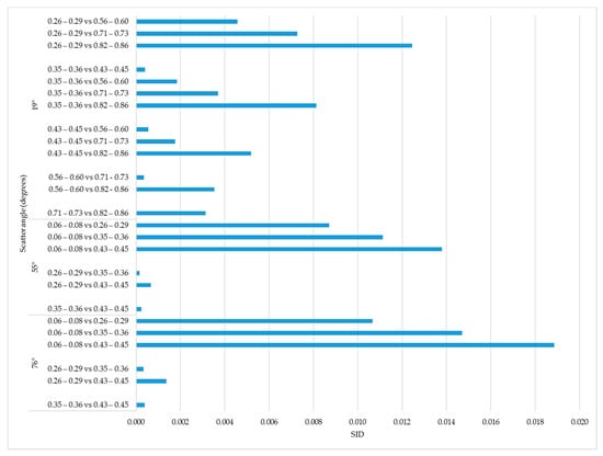 We also compared the SID of HDRFs for all sunlit fraction intervals in Table 4 between the three scatter angles. We observed the largest spectral divergence (SID = 0.037) between and 76° for (Table 5). The smallest SID (0.001) was observed between 55° and 76°. Scatter angles 55° and 76° produced the lowest SID values for all of the sunlit fraction ranges, with 0.003 the highest SID value for . In contrast, the lowest SID value for 19° vs. 55° and 19° vs. 76° were 0.017 and 0.033, respectively. The SID values for all of the sunlit fractions were the smallest for 55° vs. 76°.