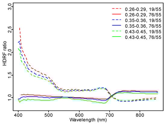 The scatter angle closest to the hot spot (β = 19°) produced higher average TOC HDRF values than scatter angles 55° and 76° in the visible region (400–700 nm), but less reflectance in the near-infrared region (700–870 nm) (Figure 7) for any fixed interval of the sunlit fraction . To investigate this, we divided the average TOC HDRF reflectance at the oblique angles (° and °) by the reflectance close to nadir (°). We observed a general decrease in the HDRF (19°)/HDRF (55°) ratio with , with especially strong dependence in the visible wavelengths. The ratio HDRF (76°)/HDRF (55°) remained more constant and was close to unity across the whole measured spectrum (Figure 8). In both cases (HDRF (19°)/HDRF (55°) and HDRF (76°)/HDRF (55°)), the highest HDRF ratio values were obtained for between 0.43 and 0.45.