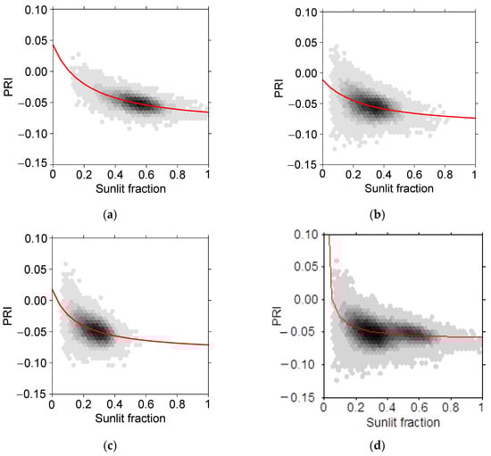 The parameters of the non-linear regression model (Figure 10) of PRI as a function of sunlit fraction are given in Table 6. The dependence of PRI on sunlit fraction becomes stronger as the scatter angle increases. This dependence is visible when all of the data is combined, and results in a steeper curve for small sunlit fraction values () (Figure 10d). A comparison of the four fitted lines in Figure 11 shows that the curves for the three scatter angles are quasi-parallel, and are intersected by the curve fitted to all data.
