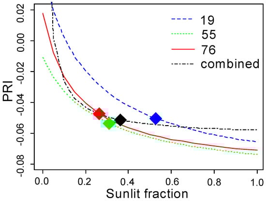 Fitted PRI vs sunlit fraction curves for 19°, 55°, and 76°. Symbols denote the location of the mean sunlit fraction for each scatter angle.