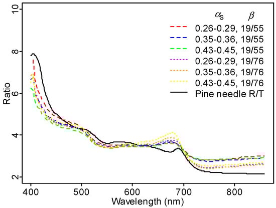 When we compared the ratio of Scots pine TOC reflectance between the direction closest to hot spot () and nadir () for different sunlit fractions, we observed a high value, especially in the blue region (Figure 8). We hypothesize that this is caused by needle wax [40]. In the visible wavelengths where leaf pigments are highly absorbing, leaf scattering is dominated by specular reflectance at the surface [41]. Specular reflectance, directed mostly in backward directions, increases strongly with decreasing wavelength in the visible spectral region. To test this, we plotted the ratio of Scots pine needle reflectance to transmittance measured in Hyytiälä in 2013 [42], and observed a pattern similar with our observed ratio between TOC reflectance for two scatter angles (Figure 12).