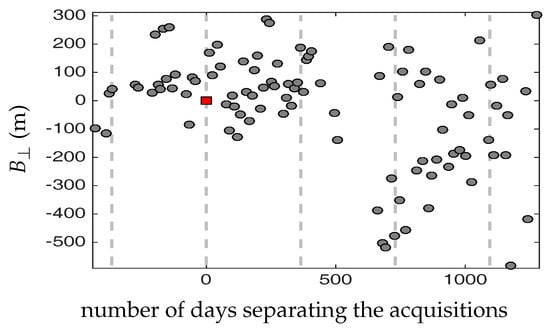 ) and the other 97 images composing the interferometric dataset given the number of days between the acquisitions. The vertical dashed lines represent the years from the reference image.