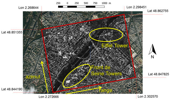 The buildings studied in this paper are known as Front de Seine elements. Front de Seine is a district in Paris, France, located along the river Seine in the 15th arrondissement at the south of the Eiffel Tower. It is one of the few districts in the city of Paris containing high rise buildings as they have mostly been constructed outside the city. It includes about 20 towers with varied designs, reaching nearly 100 m of height. The geographical location of the studied area is represented in Figure 2. This figure also links the SAR image azimuth/range geometry, in which all our SAR image extracts are represented with the geographical coordinates of the area.