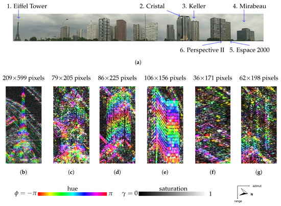 As it can be seen in Figure 3, the studied buildings have different facade structure and material. The characteristics of these buildings is listed in Table 2. The Eiffel, Cristal, Keller and Mirabeau Tower are test buildings for the interferometric and the polarimetric experiences. In order to get buildings with the same orientation but different facade characteristics, the Espace 2000 and Perspective II Towers have been added to the polarimetric analysis. Due to the high variability in their facade, these two towers have a lower backscattered signal, as it can be seen in Figure 3f for the Espace 2000 Tower and in Figure 3g for the Perspective II Tower, on which interferometric fringes can mostly be seen in the middle and the extremities of the facade. Nevertheless, the Espace 2000 Tower has the same orientation than the Keller Tower even if the proportions of the buildings differ. The main facade of Perspective II Tower and the Cristal Tower have the same orientation, modulated by the varying shape of their facade.