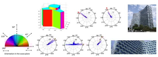First, results obtained on the Mirabeau Tower are shown in Figure 14. Five different facades with different orientations are visible on the image. Resulting orientation angles are very well correlated with our ground truth, represented by the red arrows in the charts, and by the colored representation of the 3D model. They show clearly the influence of facade orientation respective to azimuth direction. The orientations have been computed for the four polarimetric images. They do not differ a lot from one polarimetric to the other one, except for the wall exactly aligned with the azimuth. Only in this case, small differences can be noticed between the strictly monostatic acquisitions, and the quasi-monostatic ones where transmitter and receiver belong to the two different sensors TSX and TDX.