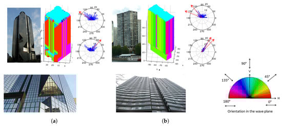 Images of the buildings and detail of its facade, orientation of the facade from the ground truth and results of estimation of polarimetric orientation. (a) Cristal Tower (b) Perspective II Tower.