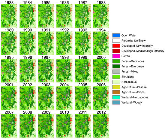 - Jin, C.; Zhu, J.; Steen-Adams, M.M.; Sain, S.R.; Gangnon, R.E. Spatial multinomial regression models for nominal categorical data: A study of land cover in Northern Wisconsin, USA. Environmetrics 2013, 24, 98–108. [Google Scholar] [CrossRef]