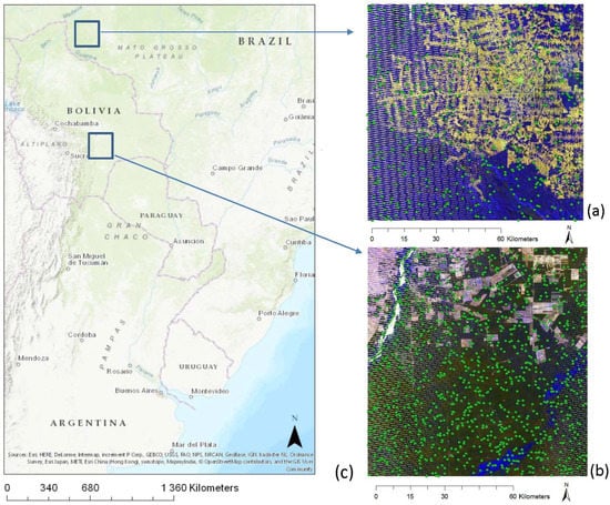 Map of the study area and validation points, using Landsat ETM+ image Bands 3, 4 and 5 in red, blue and green channels, respectively, to composite the images. (a) Brazilian site; the composite image is for 22 July 2011; green circles indicate validation points; (b) Bolivian site; the composite image is for 7 August 2011; green circles indicate validation points; (c) locations of the two study sites.