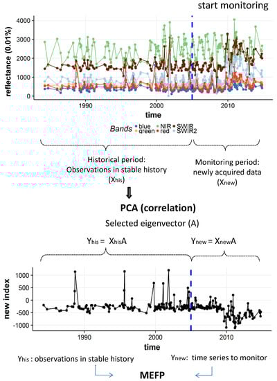 PCA is computed on the historical period of a multi-spectral time series array. The historical observations are projected to one of the PC axes and are used as the historical period for MEFP. The newly acquired data are projected to the same axis and are monitored by using the MEFP. The projected time series is: