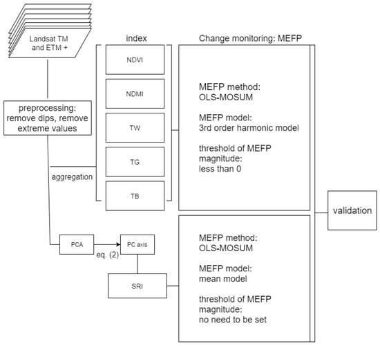 To determine how our method performs in comparison to the vegetation indices and the TCT components, we also detected deforestation from NDVI, NDMI, TCT Greenness (TG), TCT Brightness (TB) and TCT Wetness (TW) time series over the same period. The NDVI is calculated as . The NDMI is calculated as . The TCT indices are calculated using the bands’ weight given in Crist and Cicone [] for Landsat TM 5 data and in Huang et al. [] for Landsat ETM+ 7 data. Similar to SRI, we used the MOSUM-OLS (Ordinary Least Square) model to detect structural changes in the time series of vegetation indices and TCT components. Different from the SRI, we fitted the first-order harmonic model to the time series of vegetation indices and TCT components to account for seasonality effects. In addition, a magnitude of change, defined as the difference between the mean of the harmonic model fitted to the historical observations and the value at the change point, is required to be negative when a structural change is detected to declare deforestation. Figure 4 shows the procedure of our experiment comparing different indices.