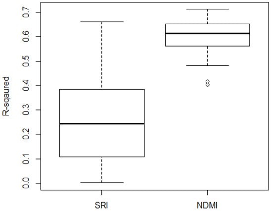We assess the seasonality of SRI and compare it with the seasonality in the corresponding NDMI, which obtained slightly better results comparing to NDVI in our experiment. The result is summarized in the boxplot (Figure 6), which indicates more variance is explained by harmonic terms in NDMI (median: 0.61) than in SRI (median: 0.24). This confirms our hypothesis that the SRI contains reduced seasonality.