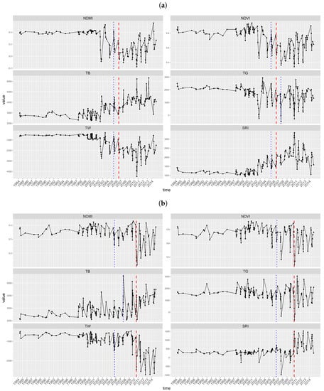 Time series of NDMI, NDVI, TCT and SRI at two sample locations of the Brazilian site. The red dashed line indicates real deforestation time; the blue dotted line indicates the time of MEFP detected deforestation. (a) Time series at location (10.345 S, 63.862 W); (b) time series at location (10.686 S, 63.595 W).
