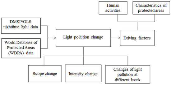 To obtain nighttime light data of protected areas, we converted protected area data from polygon to binary raster data (i.e., featuring 1-values for PAs and 0-values for all other areas) and multiplied them with the DMSP data. Considering regional differences in economic development and nature geographical features, we divided mainland China into nine parts: Northeast China, North China, East China, Central China, South China, Inner Mongolia, Northwest China, Southwest China, and Qinghai-Tibet (Figure 1). Qinghai-Tibet and Inner Mongolia were separated because they cover large areas and show characteristics different from those of the other regions. Subsequently, we studied the scope change and intensity change of light pollution in the nine regions, using the following method and the workflow of this paper is illustrated in Figure 2.