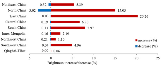 Brightness can reflect the intensity of light pollution. Firstly, to explore the general intensity change of light pollution (i.e., how many pixels were aggravated in light pollution and how many were mitigated), we used the average DN value of nighttime light data of the fifth sub-period minus that of the first sub-period and calculated the proportions of pixels increasing in brightness (DN change > 3) and decreasing in brightness (DN change < 3), respectively, while those pixels with a DN change below 3 were considered as being subject to no change [34].