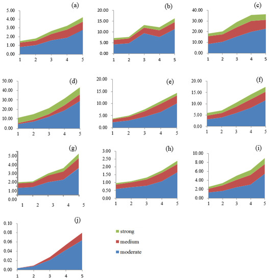 Changes of proportions of protected areas at different light pollution levels during the study period in (a) China, (b) Northeast China, (c) North China, (d) East China, (e) Central China, (f) South China, (g) Inner Mongolia, (h) Northwest China, (i) Southwest China, and (j) Qinghai-Tibet. The horizontal axis represents the sub-periods and the vertical axis represents the proportion of protected areas. The changes of areas in blue, red, and green represent changes of the proportions of protected areas at moderate, medium, and strong levels, respectively. Notably, ranges of vertical axis vary in different regions since the proportions of lit areas of different regions vary a lot.