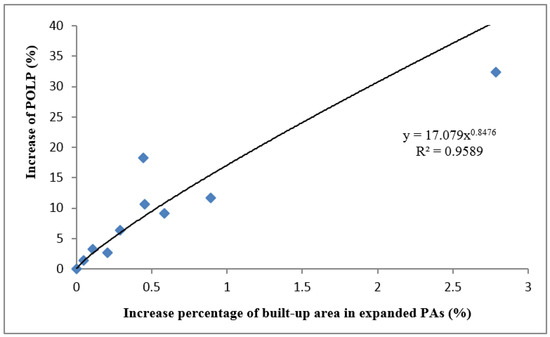 Comparison between increase percentage of built-up area a in expanded protected areas b and increase of POLP c in different regions.