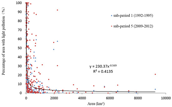 On the other hand, the intrinsic characteristics of a reserve, mainly its size and topography, are likely to influence the level of light pollution. Firstly, Figure 9 shows that smaller PAs tend to have a higher percentage of area with light pollution, possibly because a small PA is more likely to be illuminated by surrounding artificial light. This might partly explain the finding that light pollution in Southwest China was more serious than in Northwest China. Secondly, the extent of the influence of a light source is larger on flat ground than on hilly terrain [14]. The fact that light pollution in South China was not as severe as in East China and North China may be a result of the different terrain and geography of these regions. East China and North China are mainly flat, while South China is more mountainous.
