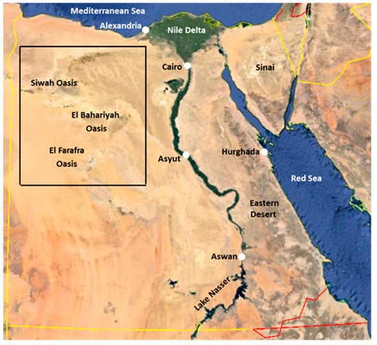 Map of Egypt showing the sites included in the analysis. The Western Desert region is marked by the rectangle (base map from Google Earth).