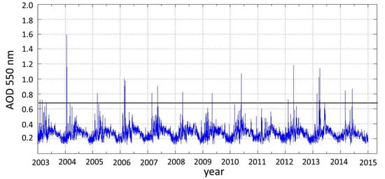 Time series of daily aerosol optical depth (AOD) over Egypt from 1 January 2003 to 31 December 2014 with the threshold (thick dark line) that defines the threshold of AOD of SAPEs.