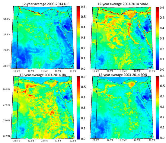 Average (2003–2014) seasonal cycle of AOD over Egypt for winter (DJF), spring (MAM), summer (JJA), and fall (SON).