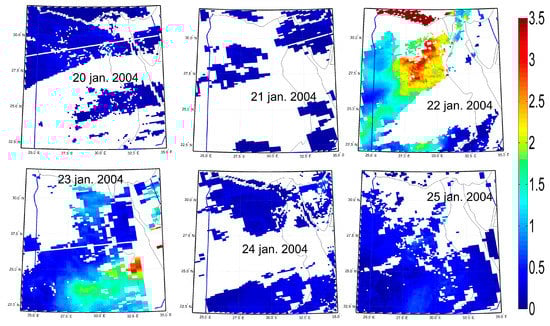Figure 3 confirms the distribution of high AOD values in the WD region compared to the eastern desert. This is caused by repeated events of sand and dust storms in the former region. An example of this type of events is shown in the spatial maps of AOD in Figure 4 for 20–25 January 2004, which include the highest observed SAPE over the period of investigation. Some maps are combinations of two orbits acquired at different times on the same day. The area of high AOD on 22 January 2004 extends over parts of the WD that include El-Bahariyah and the El-Farafra Oasis (Figure 1). More southern areas are affected by dust on 23 January although the severe event has visibly subsided before its termination on 24 January. It is worth noting the extremely high AOD (~3.5) over the coast of the Mediterranean on 22 January, which is discernible by the coastline. The accuracy of these data is unclear and may be a function of unresolved output pixels from the DT algorithm over ocean and the DB algorithm over land. Therefore, these data (over the Mediterranean just north of the northern coast of Egypt) were not included in the AOD statistics.