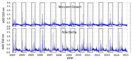 Prior studies have identified the WD region as a secondary source of dust in North Africa, with the primary Saharan source in northwest Africa [32]. In [33], the authors used NOAA’s HYSPLIT back trajectory model to examine the pathway of a similar event occurring in the fall of 2008, and confirmed that long range eastward transport of dust aerosols (at altitude 2.5–6 km) from the Western Sahara potentially affects the ND region. This can be confirmed by visually examining the two time-series of AOD over the WD and ND region (Figure 5). Coincident events of high AOD between the two regions are almost always observed in the first few months of the year (shaded areas). It is interesting to note in these cases that the AOD from the ND region is always higher than the WD region (delineated in Figure 1). The southwesterly wind carries most dust by the time it reaches the ND. There are a few high AOD events observed in the ND region with no parallel in the WD, which could be attributed to anthropogenic aerosol sources from urban activities and biomass burning in the ND region [8,10]. For the AOD in the ND region is generally higher and more erratic than the ND region. The relationship between ND and WD is further discussed in Section 4.2.5.