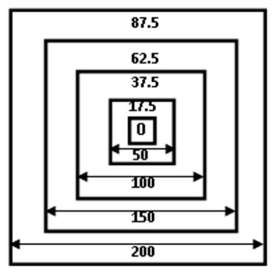 Five square domains surrounding the selected city (the center is denoted by 0). Dimension of the inner domain is 20 × 20 km. This configuration is used to calculate the AOD at distances from the center, shown by the numbers in the upper half of the figure. The spatial gradient of AOD shown in Figure 11 obtained from measurements at these distances (averages of AOD from stripes between successive domains).