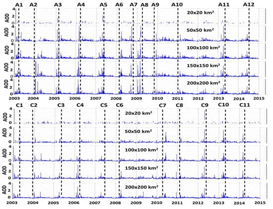 Daily time series of AOD from the five domains centered at Alexandria and Cairo are presented in Figure 7. Selected dates of severe events (SAPEs) are marked in the figure (A1 to A11 for Alexandria and C1 to C11 for Cairo). Since the 20 × 20 km2 domain has maximum of four points from the 10 km grid data, more missing data are found time series of this domain. It should be noted that the AOD average is calculated if three or four pixels of valid AOD values are available.