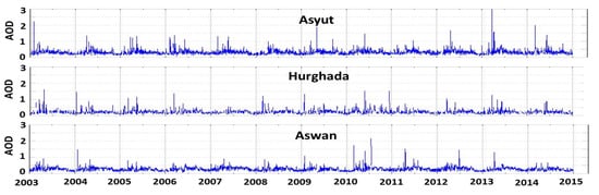 Daily time series of AOD from year 2003 to 2014, averaged over 50 × 50 km2 centered at the cities of Asyut, Hurghada, and Aswan.