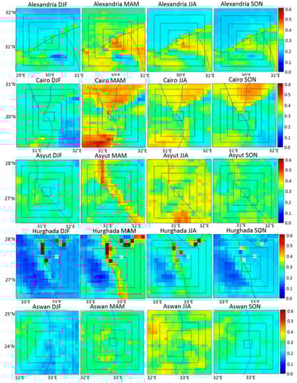 Seasonal maps of AOD, averaged over the 12-year period, are shown in Figure 9 for each city with the boundaries of the five domains in each map. Data reveal climatological features of AOD around each city. The map for Cairo covers a large part of the ND region. In general, highest AOD is found in spring and summer while the lowest exists in winter. This is consistent with the map of seasonal average AOD over the entire country (Figure 2).