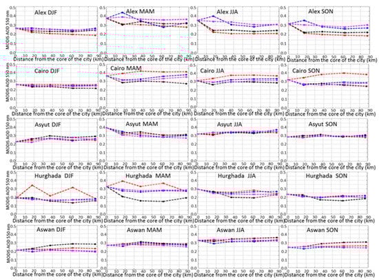 The AOD gradient around the city of Asyut is independent of direction. A small size increase is noticed within 30 km away for the city’s core in the winter and an equal drop in the spring. The weak gradients are a result of low anthropogenic emissions and the lack of precipitation in the region as well as a lower elevation that contributes to a typical continental and stable climate. In the spring, the AOD peaks to 0.4 near the urban core (consistent with seasonal maps of AOD in Figure 9), which is relatively high compared to other seasons. Near Hurghada, the AOD gradient is virtually negligible in the west and south directions. It indicates a negative gradient to the north (towards the Red Sea), which is particularly noticeable in the spring. There are some positive gradients to the east (towards the Red Sea) in the winter and spring, which reflect the unexplained high AOD of pixels along the coastline, which may be related to retrieval errors, as mentioned before. The city of Aswan also exhibits very small spatial variability, with a slightly increasing AOD away from the city’s core in fall and winter seasons, especially along the north direction.