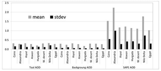 Statistics of AOD over the entire country and each one of the selected sites are presented in terms of background AOD and severe air pollution episodes (SAPE) AOD. Background AOD data includes all points in the daily record that fall below the average AOD plus one standard deviation; i.e., have where and are the average and the standard deviation, respectively. SAPE include all occurrences with [31]. Background AOD represents the normal level triggered by local emissions (e.g., anthropogenic activities throughout the year) or by aerosols transported from other regions. On the other hand, SAPEs are major aerosols events that may originate either from a distant source (e.g., dust storms originating in a bordering desert west of Egypt) or a local emission event. The thresholds of AOD that define SAPE in each selected area are included in Table 2.