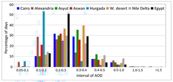 In addition to the basic statistics of the mean and standard deviation, the frequency of occurrence for selected intervals of AOD is presented in Figure 13. With the exception of Hurghada, Asyut, and the WD region, the most frequent occurrence of AOD is not different from the typical background levels (0.2–0.3) of other highly populated regions in the world [43,44]. Hurghada has a better range (0.1–0.2) in contrast to the higher value from the WD and Asyut (0.3–0.4). AOD values above 1.0 at all sites are infrequent. As for the comparison between WD and ND regions, it should be noted that the AOD occupies a remarkably wider range in the ND (up to 4.9) compared to the WD (up to 1.8) (numbers may not be obvious in the figure).