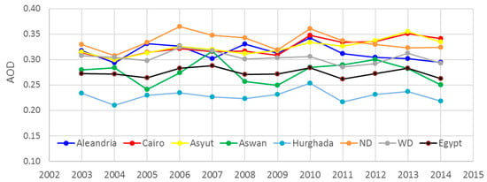 Annual average AOD from 2003–2012) over the selected cities, regions, and Egypt. Data over the cities are obtained from 50 × 50 km2 around the center.