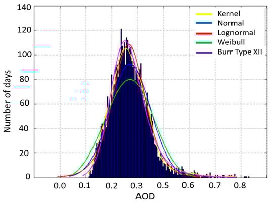 The probability distribution function (PDF) of AOD has been evaluated in prior studies to represent aerosol processes over various regions [45,46,47]. The applicability of the normal and lognormal distribution was evaluated in [45] and found that the lognormal is superior within the constraint of a unimodal probability distribution. The best fit PDF from multi-site data was estimated in [47] and found that the time scale of analysis was a factor in the distribution selection, with longer timescales represented well by lognormal distributions and shorter timescales better represented by the Weibull distribution. The AOD data in the present study are examined to estimate the PDF using five different distribution functions: kernel, normal, lognormal, Weibull, and Burr.